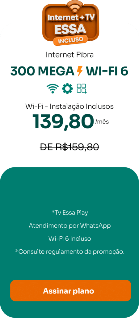 Para garantir a estabilidade de sua conexão com a internet, a ESSA instala Fibra Óptica diretamente em sua residência ou empresa. É a mais moderna tecnologia, à sua disposição 24 horas por dia, 7 dias por semana, com o objetivo de proporcionar a melhor experiência em navegação na internet.